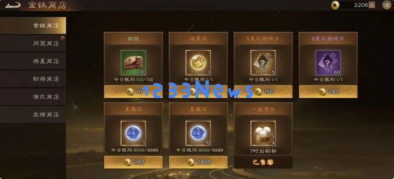 金铢商店中每日可以领取4笼免费馒头,这是必拿的福利。五星武将碎片虽然可以购买,但由于开出普通武将的概率较高,建议谨慎兑换。其他道具性价比不高,不建议花费金铢兑换。