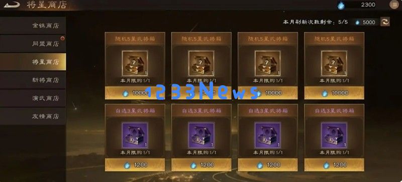 将星商店的橙色武将箱子是必买物品,虽然需要1w材料且武将随机,但有几率开出无双武将吕布。紫色箱子一般不推荐,除非急需特定狗粮武将。橙色箱子兑换次数用完后不建议刷新,可以等待自动刷新。