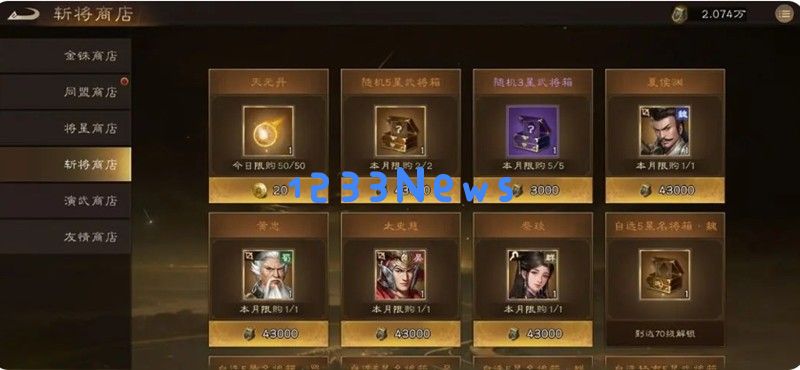 斩将商店要根据自身阵容优先兑换同阵营武将。前期可以兑换三个强力弓骑武将,后期可以转向武将箱子来优化阵容。演武商店改版后可以单买武将碎片,赛季最高段位加胜场奖励可获得4.91w兑换币,需要进入克敌争霸前100名才能获得足够兑换完整武将的5.4w兑换币。