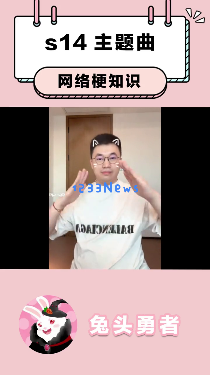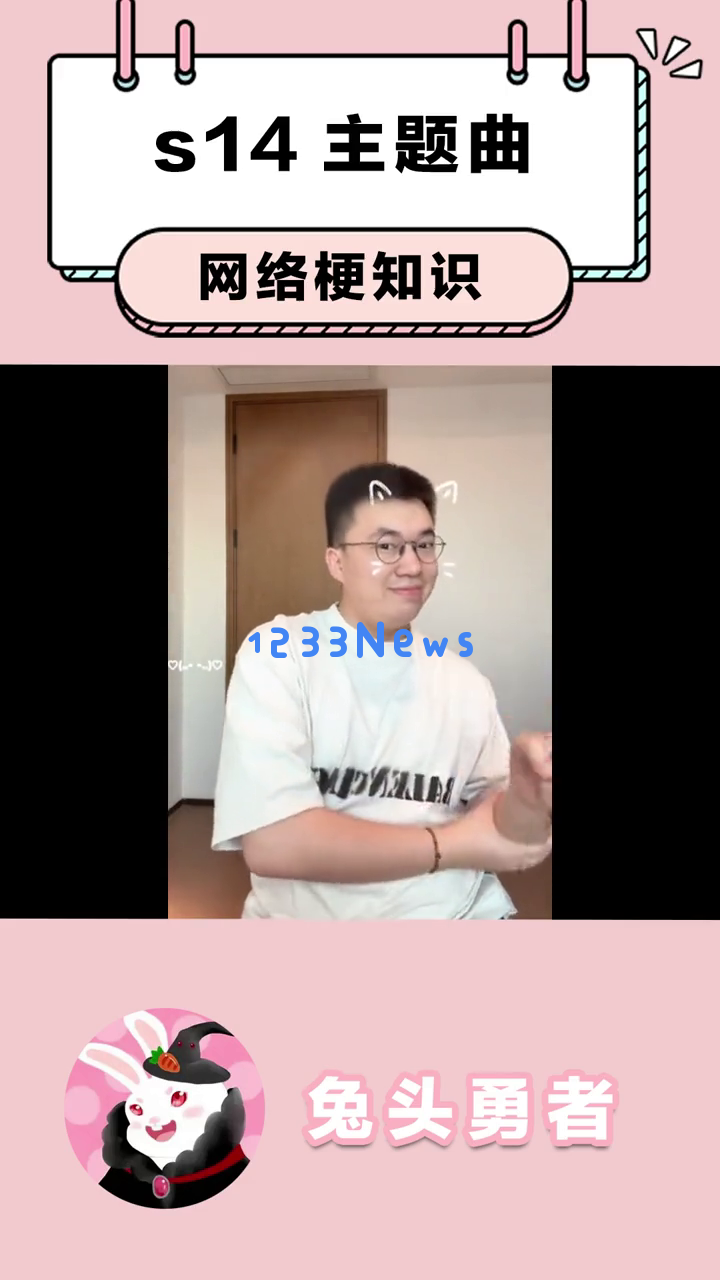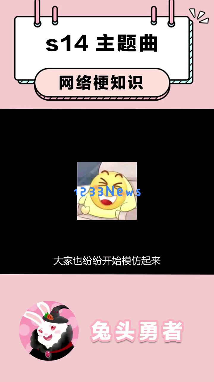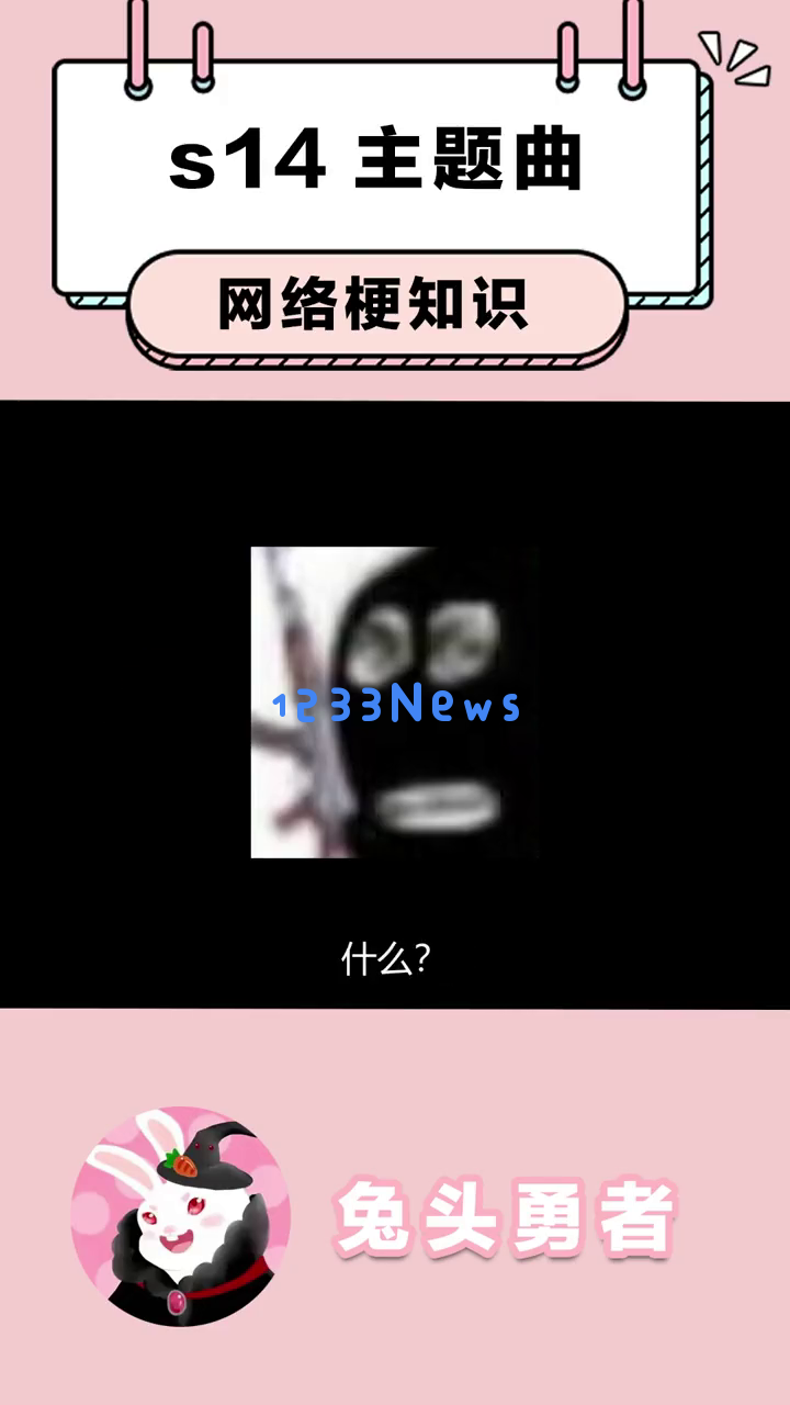 首先,我们看到一个可爱的卡通兔子形象出现在屏幕上,提示这是关于s14主题曲的网络梗知识。这个兔子戴着黑色帽子,穿着红色衣服,背景是粉色的,看起来非常萌。