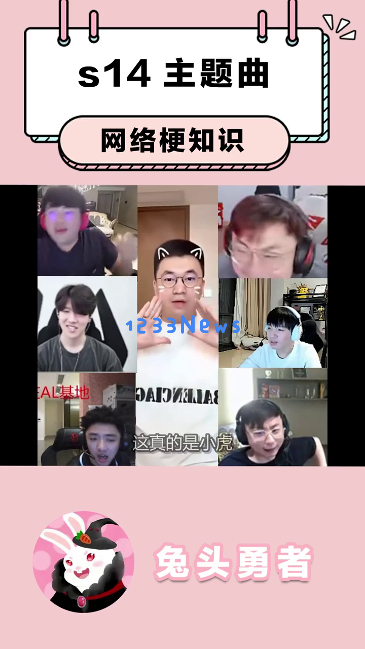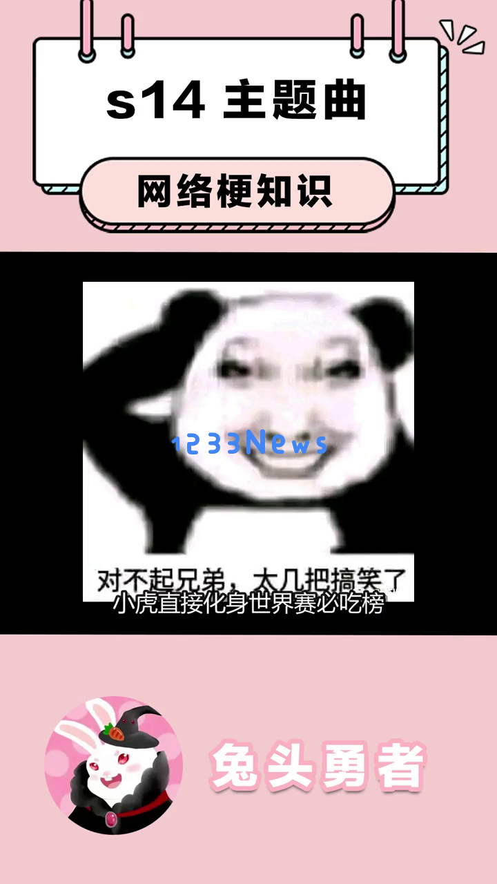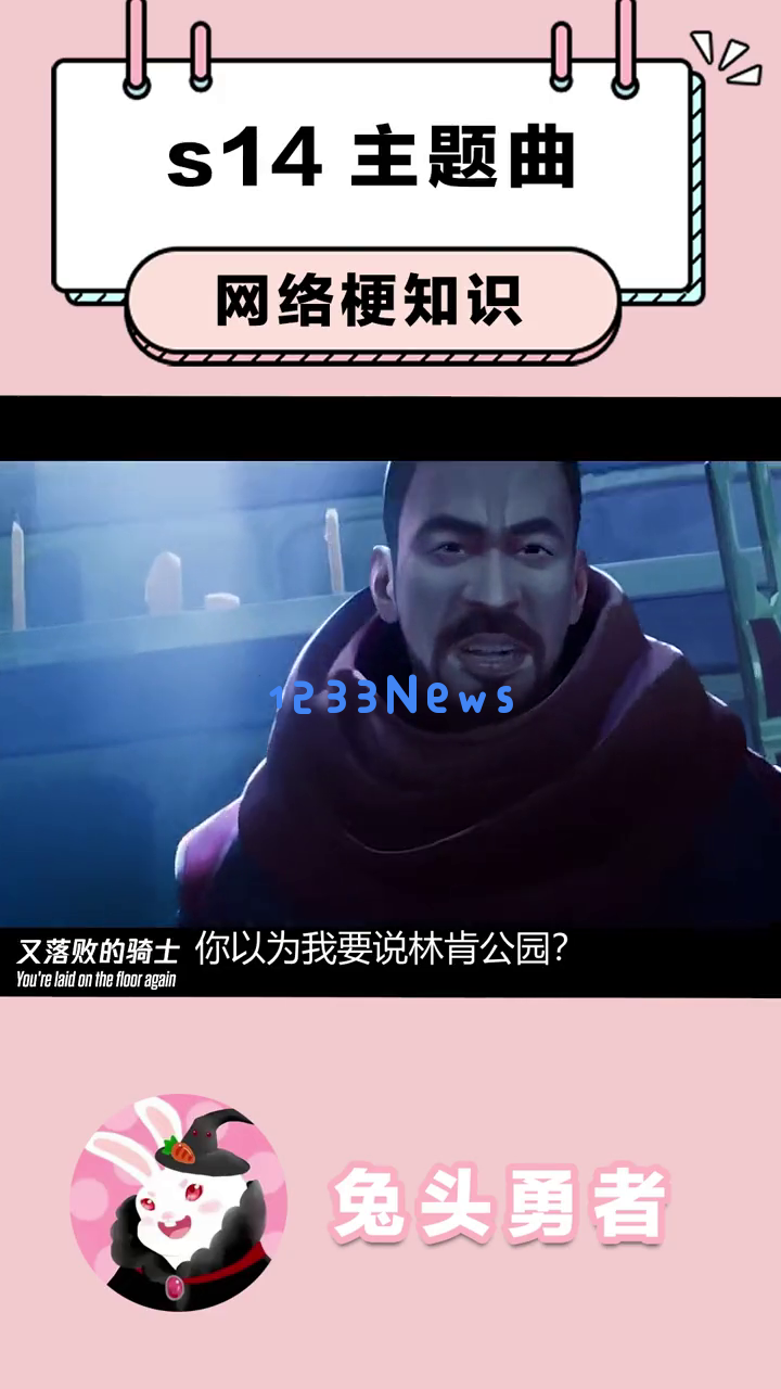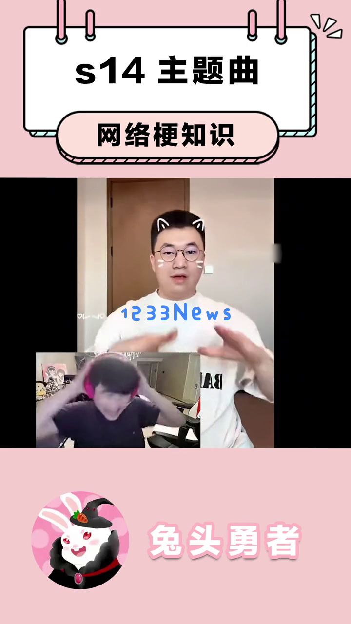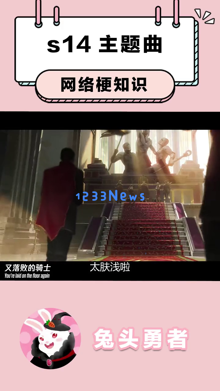 首先,我们看到一个可爱的卡通兔子形象出现在屏幕上,提示这是关于s14主题曲的网络梗知识。这个兔子戴着黑色帽子,穿着红色衣服,背景是粉色的,看起来非常萌。