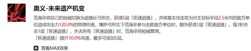 范海辛的奥义技能可以让他从枪形态切换至弓形态,同时获得五层疾速追猎效果。每次击败敌人都会提升攻击速度,每三秒会自然流失一层效果。这个机制要求玩家精准把控战斗节奏,在五层效果叠满时能爆发出惊人的输出能力。