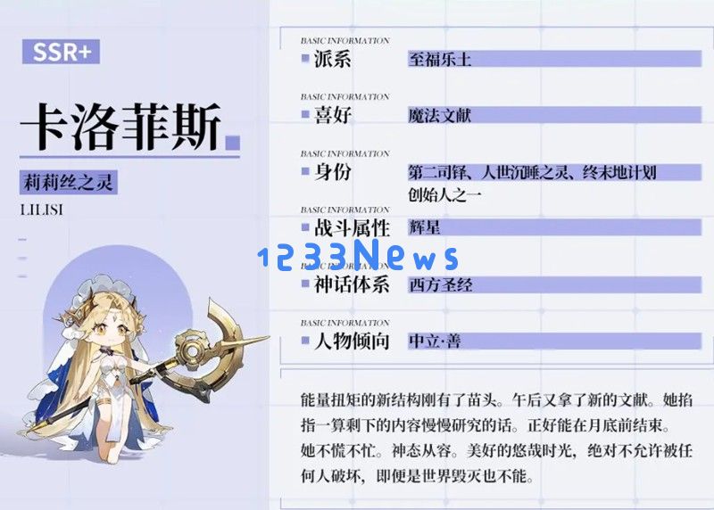 在时隙之旅的战斗系统中,卡洛菲斯属于辉星系法师,被玩家们亲切地称为"辉星系优雅的魔女"。她的角色原型源自西方圣经神话体系,性格定位属于中立·善阵营。作为SSR品质的角色,卡洛菲斯在法师职业中拥有独特的战斗定位。